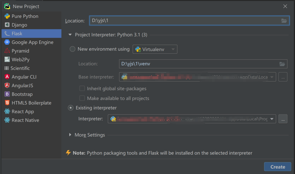 然后就是打开pycharm,创建一个flask项目,这里建议选择第二个选项,Existing interpreter,就是已经存在的解释器,这样不用每次都要配。