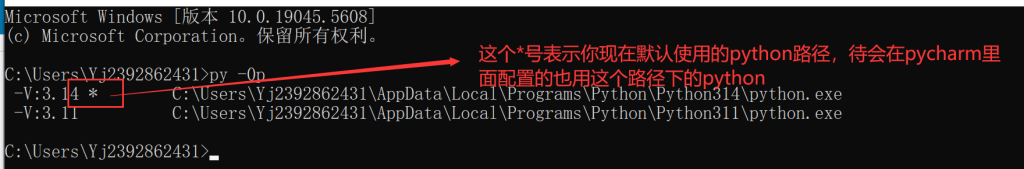 如果大家安装了多个python版本,注意,在pycharm配置的解释器用你全局配置的版本所在的文件夹,我刚开始就因为这个pycharm选择配置的解释器和电脑全局使用的默认解释器不一样,导致我傻乎乎的全局安装了一些包,但是在pycharm里面却死活找不到包,一引用就报错,真被自己蠢哭了,我这里就再补充一下,先用命令看一下自己的使用python的路径: