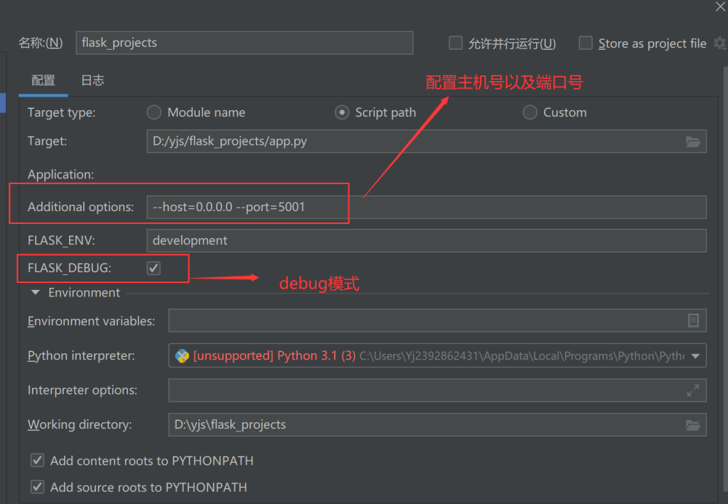 之后我介绍我学习的项目架构与这个又不一样,但是我感觉大致是一样的,然后我们可以设置一下配置信息,点击那个小辣椒(hh)有一个配置选项,打开后可以手动设置debug模式,这个模式是什么呢,就是我们在修改了一部分代码后,不需要重启项目,直接保存文件后,刷新一下就可以看结果了,然后可以使用—host=xxxx设置主机号,–port=xxxx设置端口号,如下所示: