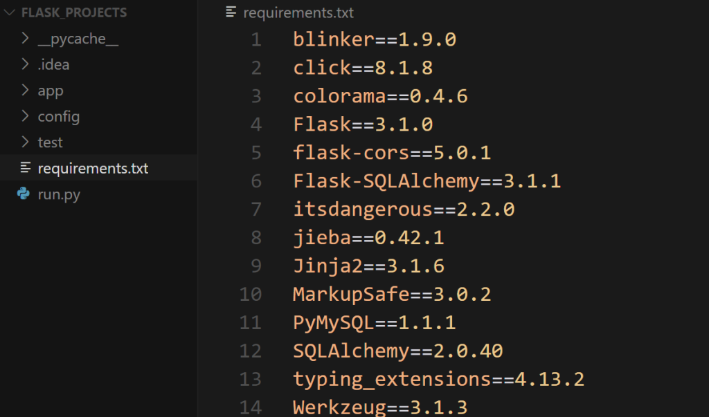 项目根目录总run.py是应用程序的入口文件,也就是我们用户启动flask应用,而requirements.txt是用于记录flask的项目依赖,那他具体有什么用呢——当别人丢给你一个flask项目,那你想要跑起来,是不是要有环境,requirements.txt这个文件就是记录你想要运行这个项目需要下载的依赖。咱们拿到项目后,第一步就是执行下列命令,安装项目依赖: